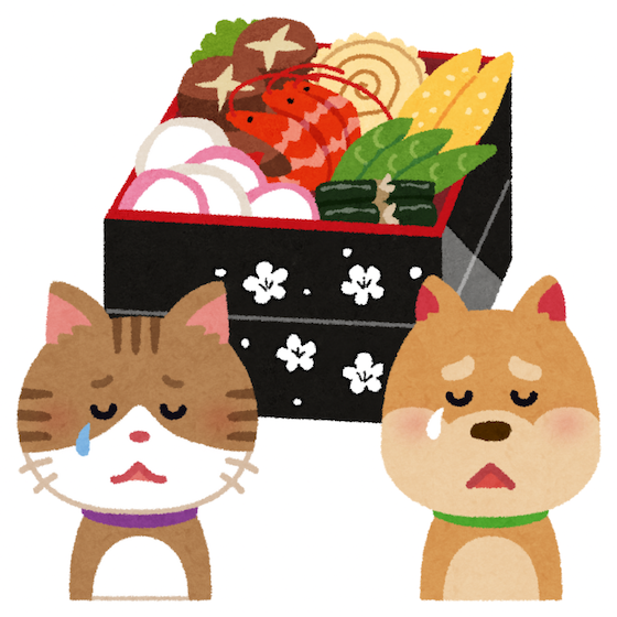 おせち料理など特別な料理を食べる機会が増える年末年始は、わんちゃん・ねこちゃんの誤食が特に多くなる時期です。この時期は親戚が集まる、帰省をするなど、普段と生活環境が変わりやすいため、誤食事故が起こりやすくなります。