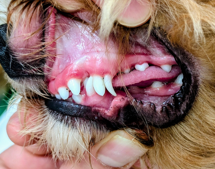 乳歯遺残(にゅうしいざん)とは、犬や猫で永久歯が生えてくる時期(生後4~6ヶ月頃)を過ぎても乳歯が脱落せずに残ってしまう状態のことを言います。乳歯歯根が成長と共に吸収されないことに起因しますが、小型犬に好発することから遺伝的要因が原因と考えられています。遺残した乳歯が放置されると、歯並びが悪くなったり(咬合異常)、永久歯との隙間に汚れが溜まり口臭や歯周病のリスクの悪化を招きます。治療は、全身麻酔下での抜歯手術が必要となり、避妊・去勢手術と同時に行うことも推奨されます。「永久歯が生えてきたのに乳歯が残っている」と気づかれた場合は、お早めにご相談ください。