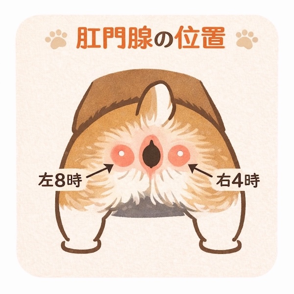 ご自宅のわんちゃんねこちゃんの肛門腺絞りを行っていますか。肛門腺とはわんちゃんねこちゃんの肛門の左右に一対してある袋状の分泌腺のことで、肛門を中心に時計を思い浮かべ、斜め下(4時・8時)に位置します。溜まりすぎると炎症が起きたり、破裂してしまうことがあるため月に1〜2回絞ってあげましょう。