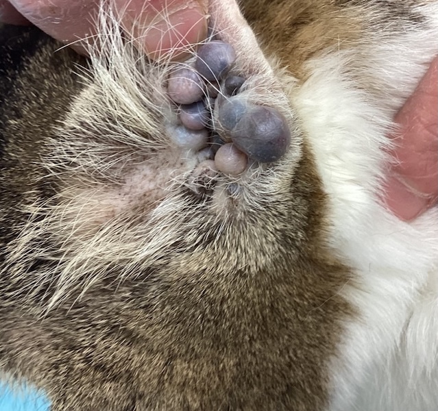 猫で認められる疾患で、耳の内側に黒色〜青黒いドーム状の小さな嚢胞(膨らみ)が多数形成されるのが特徴です。加齢性変化、慢性的な耳の炎症、先天性の耳垢腺導管の閉塞などが関係しているのではないかと考えられています。特徴的な見た目で診断を考えますが、腫瘍などとの区別が必要になる場合もあるため、必要に応じて細胞診検査などを行います。治療は、状況に応じて、耳の洗浄、内服薬や点耳薬の使用、レーザー治療、外科的切除などを検討していきます。重症になると、嚢胞が大きくなり、耳の入り口を塞いでしまうこともあります。気になる症状がある場合には、お早めにご相談ください。