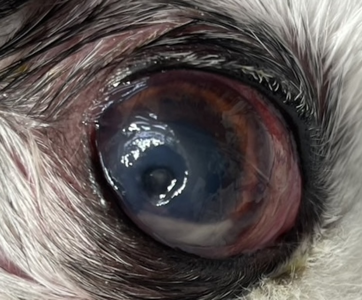 デスメ膜瘤とは、角膜潰瘍が重度に進行し、デスメ膜という非常に薄い層だけが残った状態です。犬・猫どちらにも起こり、見た目としては角膜の中央が透明〜白っぽく、ぷくっと膨らんで見えることがあります。この状態では角膜が非常にもろく、少しの刺激でも角膜に穴があく角膜穿孔を起こす危険性があります。原因としては、感染性角膜炎、外傷、ドライアイなどによる角膜潰瘍の悪化が多く、短頭種や高齢の動物でよくみられます。デスメ膜瘤は点眼治療だけでの改善が難しく、状態によっては角膜を保護するために外科的な治療が必要になります。治療が遅れると視力の低下や失明につながることもあるため、目の痛み、充血、白く濁る、目を開けにくそうにするなどの症状がみられた場合はお早めにご相談下さい。