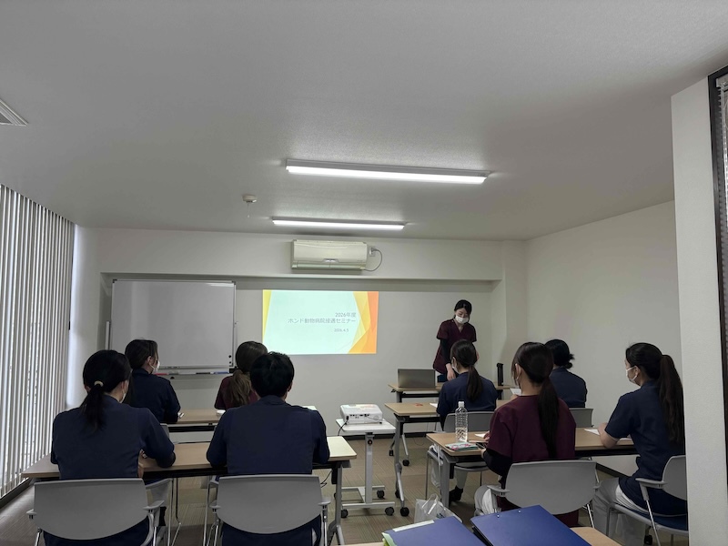 先日、院内研修の一環として、新人スタッフを対象に接遇セミナーを実施いたしました。本セミナーでは、医療現場における基本的なマナーやコミュニケーションスキルについて学ぶとともに、ご家族の皆様がどのようなお気持ちで大切なワンちゃん・ネコちゃんを連れてご来院されるのかを考え、安心していただくために必要な対応について意見を出し合いました。また、ロールプレイングを通して、待合室における安全・安心に配慮した立ち振る舞いができるよう、実践的な練習にも取り組みました。今後もホンド動物病院ではスタッフ教育に力を入れ、皆様に安心してご利用いただける環境づくりに努めてまいります。