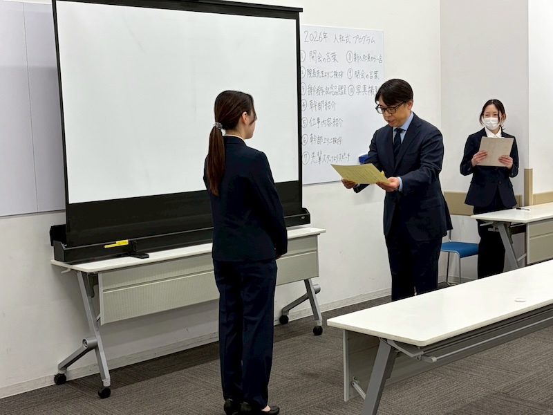 先日、2026年度入社式を執り行い、新たに4名の新入社員を迎えました。新入社員の挨拶では、それぞれが獣医師・愛玩動物看護師を目指したきっかけや、今後の抱負について熱い想いを語ってくれました。フレッシュな力が加わり、スタッフ一同大変嬉しく思っております。今後も、より質の高い医療と温かいケアの提供に努め、皆さまに信頼いただける動物病院を目指してまいりますので、今後ともよろしくお願い申し上げます。